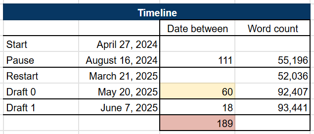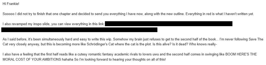 People might have told you to work on another project while you’re querying or on sub, but they never told you how hard that is. They didn’t tell you all the turmoil you would go through when you’re waiting and how there’s a war inside your head and it paralyzes you from producing any word. The 50k-curse was this: I wrote 55k from April 27, 2024 to August 16, 2024, and I only liked about 20k. Once I came back to continue writing, I made the fatal mistake of editing instead of drafting. I kept editing and rewriting up until the 50k mark when I lost my stamina. By 2025, I have read the draft like 4 times and words stopped meaning so much to me. I considered just putting it on hold altogether and working on something else, you know, maybe I just wasn’t ready to draft it. But as I put together my WIPkipedia for my agent, I somehow convinced myself I should at least finish #codewip.