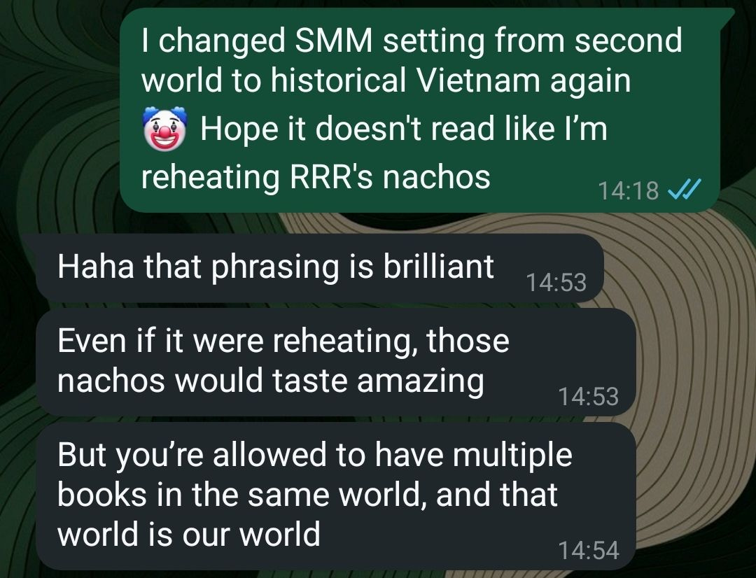 Now you can’t assume I had no temptation. I sometimes had to sit on my hands to stop myself from editing. About a week before I finished Draft #0, I came up with 2 rogue thoughts and I was in everyone’s DMs asking if I should change them now. The compromise I negotiated with myself was to keep a list of editing points and work on them after draft #0 is finished. Who knows, rushing to edit it into the draft might be a stupid idea. I needed to sleep on them first.
