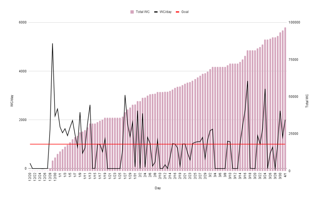 This chart shows my progress for the first draft. Overall, I set a target of 1,000 words a day. I flatlined a lot of times, but I also went over the goal a lot of times. I was proud of my achievement. Finishing a draft in 4 months was a beast I would never tempt again, but this was just to show you how passionate I was about this project. After a month of editing and getting my query package to its best form, I re-entered the trenches with the second book. At this point, I still got a few full requests for the first book, but they had all gone silent after a few months.