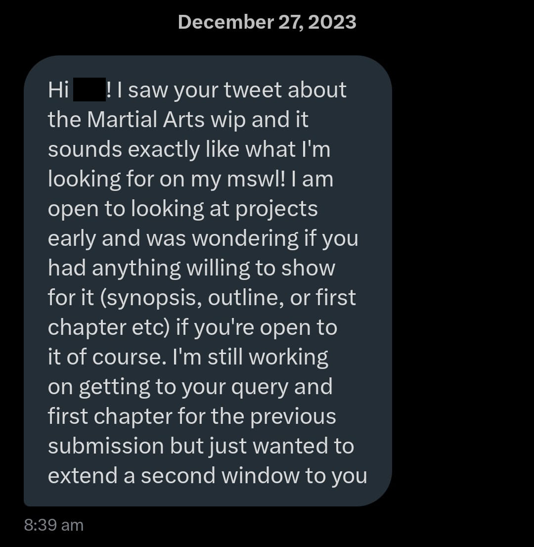 On December 26th, 2023, I posted a silly tweet and coined the term #MartialArtsWIP for my next project. It was still at the very beginning of its life when I made the moodboard and announced it to the writing community. I still remember just a few nights before, I was struggling with coming up with a good enough plot and trying out the snowflake method with my friends. I just finished my rough synopsis for the book when I received this message from an agent: