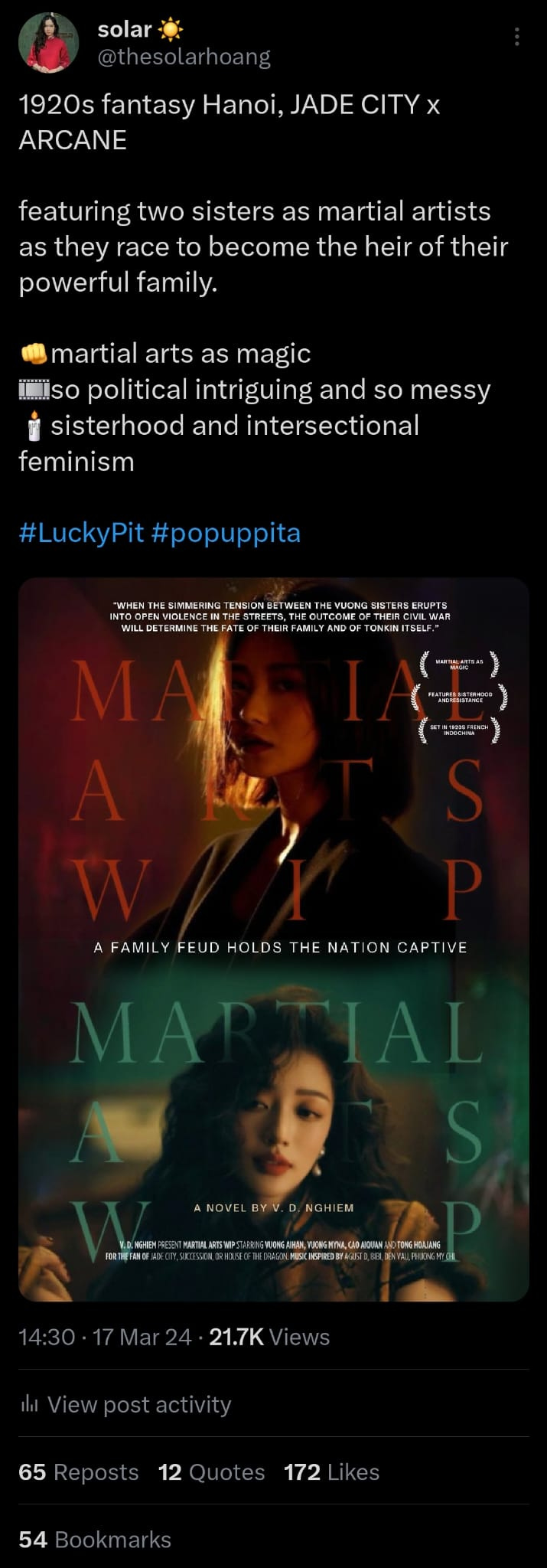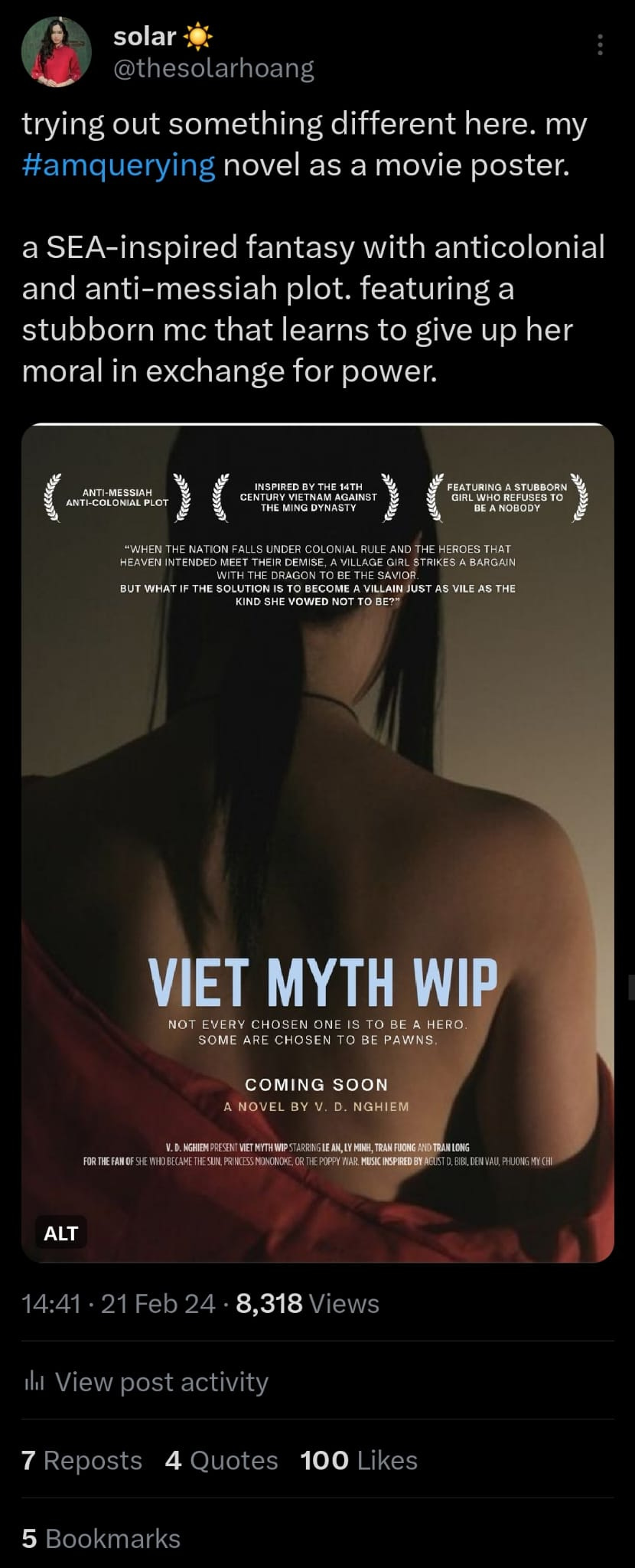 As a lover of Vietnamese mythology, I was fascinated with how most of our folklore and mythology centered around real historical figures. I wondered, at which point history becomes a myth, and decided to write something inspired by a historical figure in Vietnamese history. I got to around 53k when I had to pause to write my thesis (a cockblock, I know), but I assured you, within those 4-month hiatus, I did not stop thinking about #VietMythWIP.