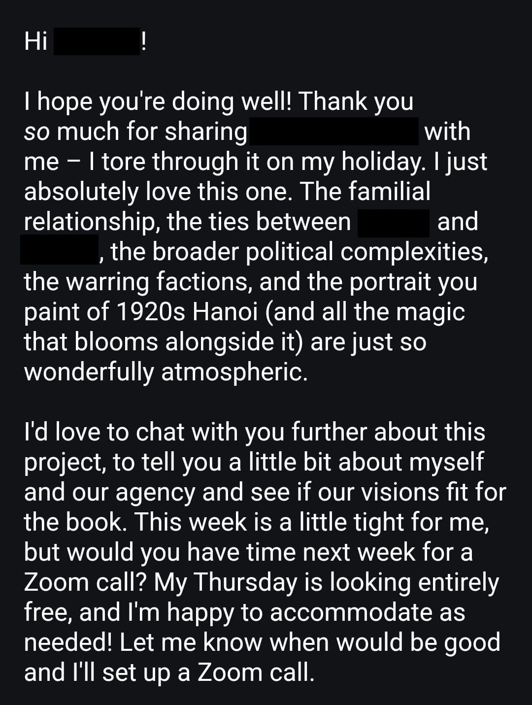 I waited for one full week before getting on the call. I did not know what to expect, where to put my hands, if it was a R&R call or an offer call. The agent was so lovely and she was gushing about the book (which inflates my ego). And after that, I sat back and it hit me for the first time—I am vague.